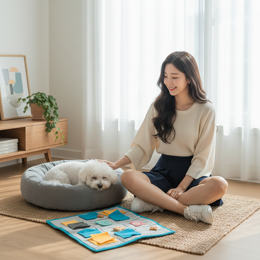- 노즈워크 & 퍼즐 장난감: 보호자 부재 시 반려견이 에너지를 긍정적으로 소모하고 집중할 수 있도록 노즈워크 장난감이나 퍼즐 장난감에 간식을 넣어 제공합니다. 후각 활동은 스트레스 해소에 매우 효과적입니다.